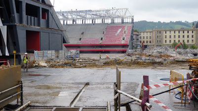 En junio se inició el traslado de los primeros materiales desde la capital vizcaína hasta las inmediaciones de Sestao. Las instituciones públicas que participan en la Ibarzaharra, S.A., propietaria del área industrial de Sestao y las empresas actualmente involucradas en la demolición del campo de San Mamés han acordado esta operación con un doble objetivo. Por un lado, como medida sostenible para favorecer la reutilización de material de desecho que pueda ser utilizado para favorecer otro tipo de actividades y por otro, porque se reduce en unos 600.000 euros estimados la inversión destinada a la necesidad de adquirir por parte de Ibarzaharra, S.A., material de relleno exigido por el Departamento de Medio Ambiente (URA), para que el futuro polígono industrial de Ibarzaharra pueda ser una realidad. Así mismo, este acuerdo favorecerá los plazos de ejecución previstos en el plan de remediación del suelo y urbanización pública de la parcela destinada a actividades económicas.