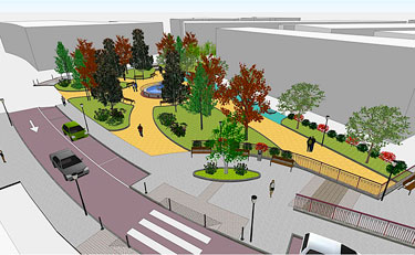 El parque constará de una plaza con arbolado de gran porte, fuente central, bancos y una zona de aparatos biosaludables para mayores. La zona se unirá con la placita de arranque del ascensor inclinado de Prim, generando otra huella, esta vez pavimentada, de otros 3000 metros cuadrados en la que se eleva la calzada de Prim en ese tramo para unificar las dos plazas. En esta segunda plaza habrá una zona estancial de bancos y otra de juegos infantiles. Estas dos zonas, la huella verde y la huella gris, se conectan a través de escaleras y una rampa para garantizar la seguridad.