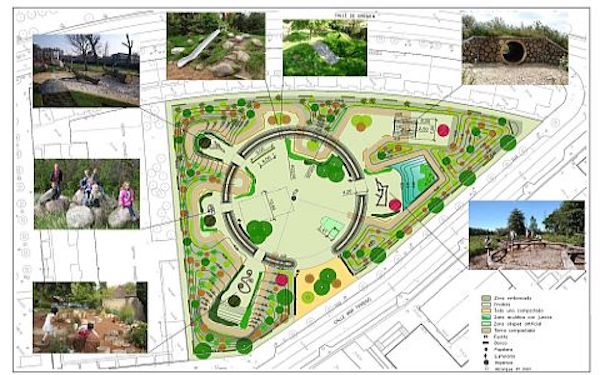 El proyecto diseñado consta de varias zonas ordenadas en forma de círculo: en el centro habrá un claro que incorporará varios juegos. Ese claro estará rodeado por una especie de ‘dónut’ de tierra que servirá para delimitar esa zona central de esparcimiento y que también para jugar. Fuera de ese murete, por su parte, se establecerán distintas zonas con juegos integrados en la naturaleza, en un entorno más ‘emboscado’.