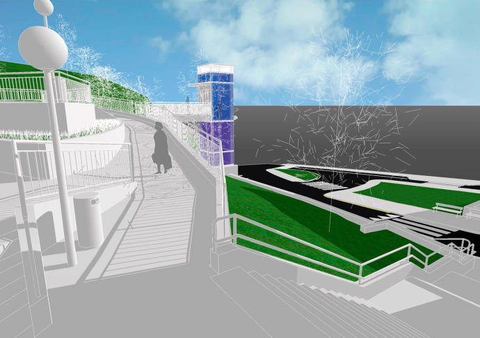 Por su parte, en la ladera situada entre los portales 14 y 15 se colocará un cuarto ascensor que pretende solventar la accesibilidad entre la plataforma que da acceso a los bloques número 12, 13, 30 y 31, la plataforma donde se encuentran los portales 14, 15, 32 y 33 y la plataforma correspondiente a los bloques de viviendas número 16 y 34.