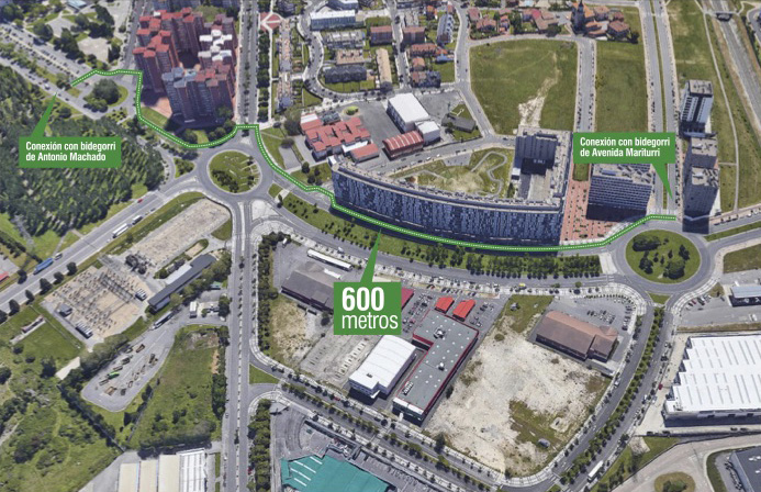 Y es que en esta calle se plantea una nueva conexión ciclista que unirá la Avenida del Cantábrico y Avenida del Zadorra. Esta intervención contará con tres tramos diferenciados. En dos de ellos, el bidegorri sustituirá la actual la línea de aparcamiento (desde Avenida del Cantábrico hasta la plaza Río Santo Tomás, y en la parte Norte de la calle, en la zona más cercana a Avenida del Zadorra). En el tramo central, desde Río Santo Tomás hasta la bifurcación final de los carriles, el bidegorri se construirá a cambio de la eliminación de un carril de circulación.